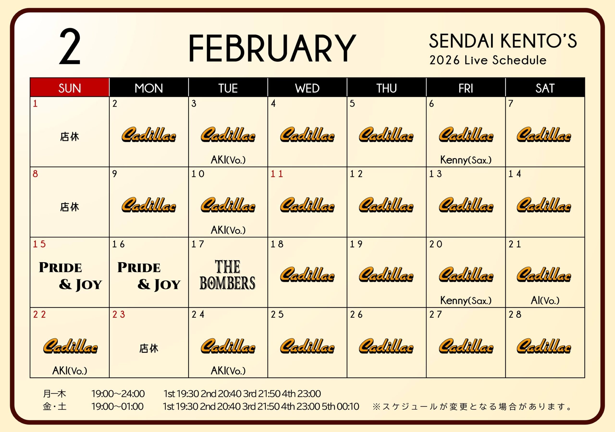 🎶仙台ケントス2月ライブスケジュール🎼