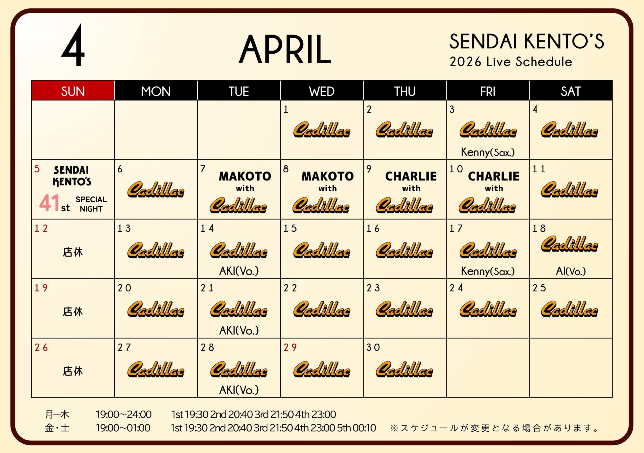 🎶仙台ケントス4月ライブスケジュール🎼